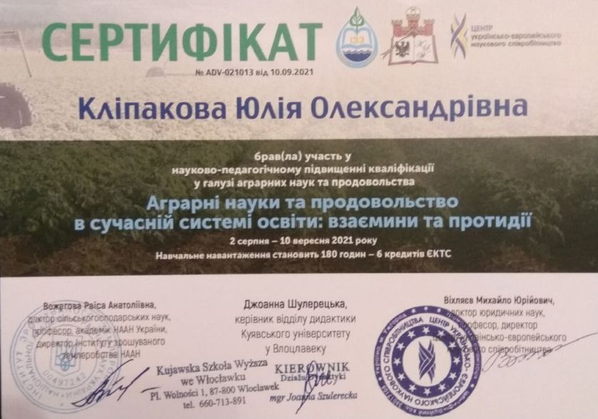 Днями старший викладач кафедри рослинництва імені професора В.В. Калитки Юлія Кліпакова отримала сертифікат щодо проходження науково-педагогічного підвищення кваліфікації у галузі аграрних наук та продовольства «Аграрні науки та продовольство в сучасній системі освіти: взаємини та протидії».