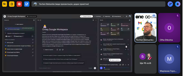 Окрему увагу приділено організації ефективної роботи в екосистемі Google Workspace for Education та використанню ChromeOS в освітньому середовищі. Також було продемонстровано інструменти трансформації навчального процесу за допомогою NotebookLM, а можливості створення майже No-Code рішень — через AppSheet та AppScript, що відкриває нові перспективи для цифровізації навчання без глибоких навичок програмування.