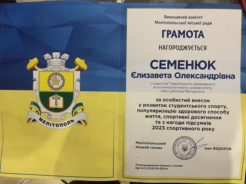 - студентку VI курсу факультету агротехнологій та екології Єлизавету Семенюк, гравця жіночої мелітопольської команди з флорболу “Скала”, кандидата в майстри спорту України з флорболу.