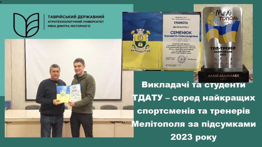 За особистий внесок у розвиток фізичної культури і спорту, ігрових видів спорту, популяризацію здорового способу життя, організацію й проведення фізкультурно-оздоровчих і спортивних заходів в 2023 році відзначено подяками виконавчого комітету Мелітопольської міської ради д.т.н., професора, радника ректора ТДАТУ Володимира Кюрчева, який на громадських засадах обіймає посаду голови Мелітопольської федерації футболу, та в.о. завідувача кафедри фізичного виховання і спорту Олексія Нестерова. Грамотою за особистий внесок у розвиток ігрових видів спорту нагороджено старшого викладача кафедри фізичного виховання і спорту Олександра Магулу.