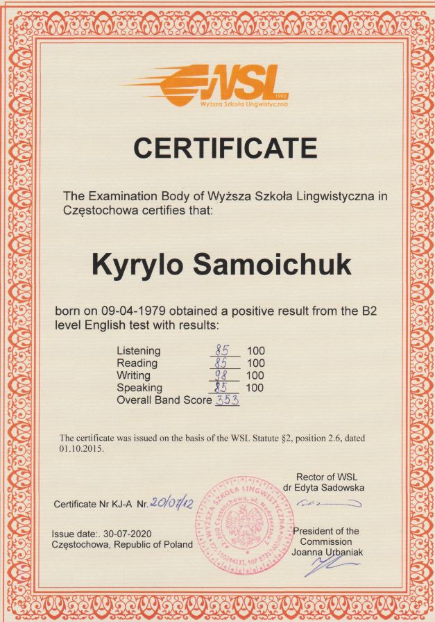 Завідувач кафедри імені професора Ф.Ю.Ялпачика Кирило Самойчук взяв участь у реалізації програми «Розвитку мовленнєвої компетентності на рівні В2» у Вищий Школі Лінгвістичній (Ченстохов, Республіка Польща).