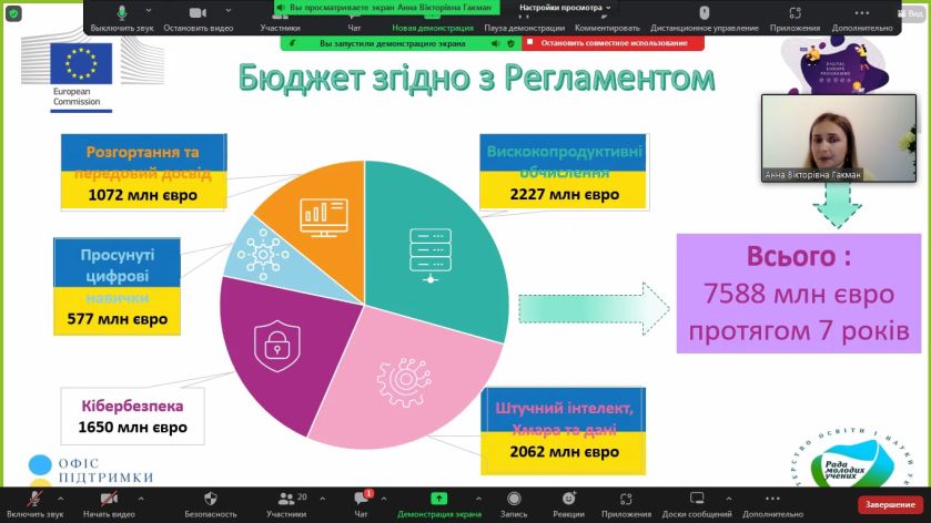 Програма «Цифрова Європа» фінансуватиме гранти на зміцнення потужності суперкомп’ютерів та обробки даних ЄС, підтримку розробки та проведення спеціалізованих програм і стажувань для майбутніх експертів у ключових сферах потенціалу, таких як дані та штучний інтелект, кібербезпека, квантові технології, зелені технології, культурний сектор та інше. Загальний бюджет програми складає 7,5 мільярдів євро.