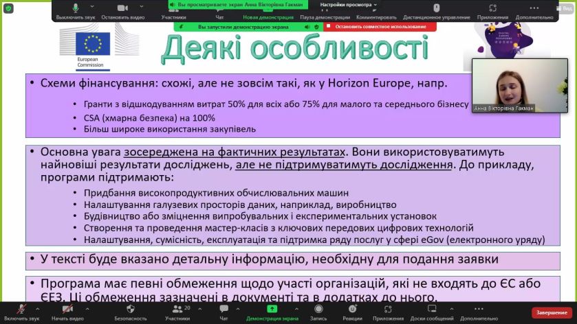 Протягом вебінару було обговорено особливості програми, пошук партнерів, заповнення заявок, фінансування тощо.