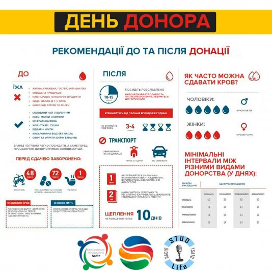 Тож з напередодні свята пропонуємо вам долучитися до акції «День донора» 9 червня. Донором може бути кожен дієздатний українець віком від 18 років. Вага має бути не менше 50 кг – інакше забір крові може бути небезпечним для здоров’я. Щоб стати донором, необхідно пройти відповідне медичне обстеження у медзакладі перед здачею крові, аби перевірити відсутність протипоказань, визначених МОЗ України. Рекомендації «до» та «після» донації представлені на зображенні.