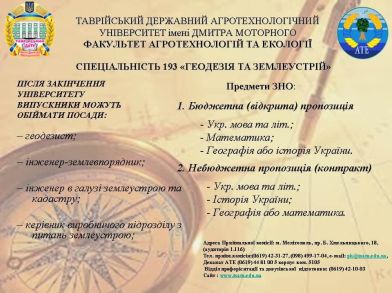 ТДАТУ – один із найрейтинговіших університетів не тільки міста та області, а й України в цілому. Тому, маючи вступний рейтинговий бал 196 я – абітурієнт, майже однозначно вирішила, куди буду вступати. Все моє шкільне життя було пов’язане з географією та науками природничого спрямування, тому я обрала для себе перспективну, високооплачувану і затребувану в сучасному світі професію – Геодезист.