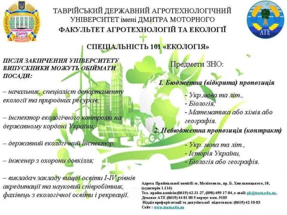 Тож рекомендую вступати до Таврійського державного агротехнологічного університету імені Дмитра Моторного за напрямом підготовки 101 «Екологія», адже це Ваш шанс досягти успіху в житті!
