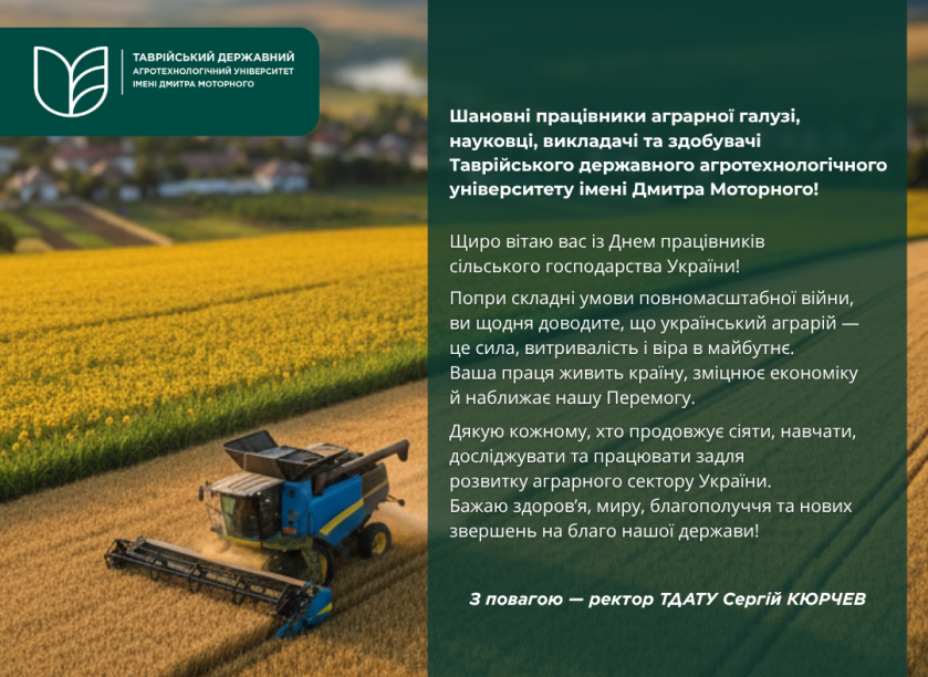 «З повагою до тих, хто творить добробут країни: привітання ректора ТДАТУ з Днем працівників сільського господарства» 16.11.2025