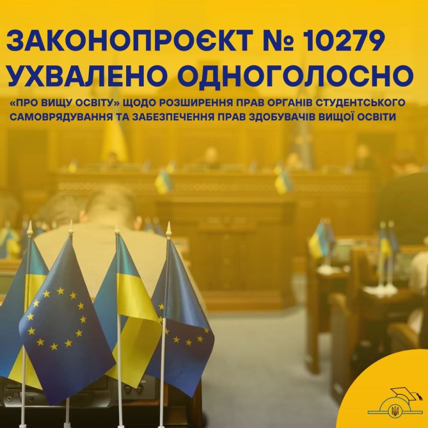 Верховна Рада України одноголосно ухвалила у першому читанні законопроєкт № 10279 про внесення змін до Закону України «Про вищу освіту» щодо розширення прав органів студентського самоврядування та забезпечення прав здобувачів вищої освіти, який містить значні покращення для студентства.
