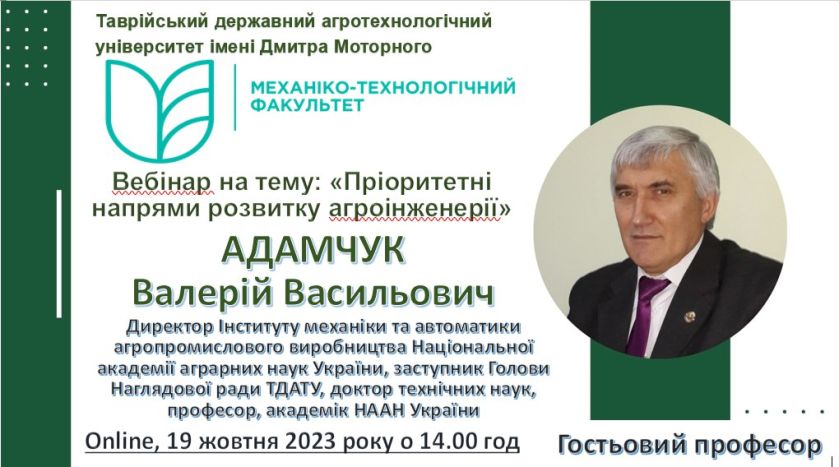 Спікер – Адамчук Валерій Васильвович, директор Інституту механіки та автоматики агропромислового виробництва Національної академії аграрних наук України, заступник Голови Наглядової ради ТДАТУ, доктор технічних наук, професор, академік НААН України.