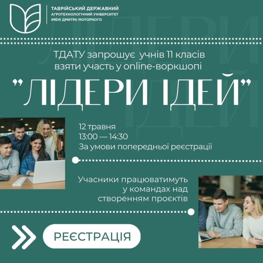 Вітаємо, друзі! Триває реєстрація 11- класників для участі у online-воркшопі «ЛІДЕРИ ІДЕЙ», який проводить креативна команда Таврійського державного агротехнологічного університету імені Дмитра Моторного.
