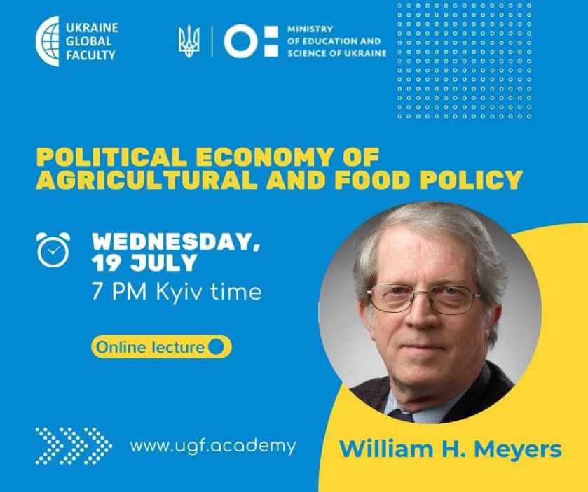 Запрошуємо долучитися до онлайн лекції почесного професора аграрної та прикладної економіки Науково-дослідного інституту продовольчої та аграрної політики Університету Міссурі, PhD William H. Meyers– «Political Economy of Agricultural and Food Policy», яка відбудеться на міжнародній освітній платформі Ukraine Global Faculty.
