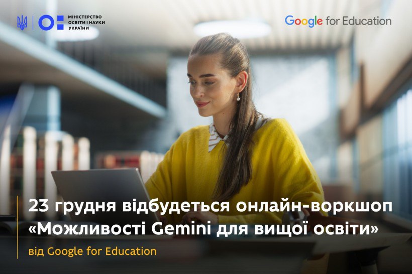 23 грудня о 16:00 приєднуйтеся до онлайн-воркшопу «Можливості Gemini для вищої освіти» від компанії Google for Education, організованого за підтримки Міністерства освіти і науки України.