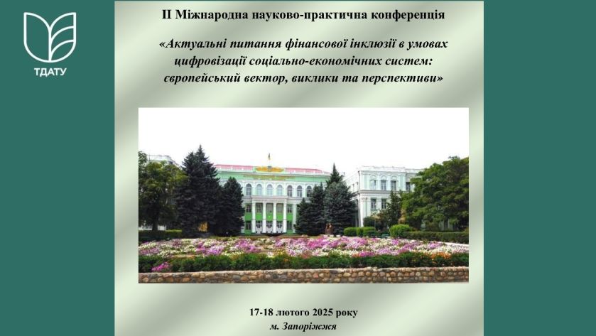 17-18 лютого 2025 року на кафедрі фінансів, обліку і оподаткування ТДАТУ відбудеться ІІ Міжнародна науково-практична конференція «Актуальні питання фінансової інклюзії в умовах цифровізації соціально-економічних систем: європейський вектор, виклики та перспективи».