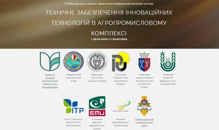 Шановні колеги та здобувачі вищої освіти! Запрошуємо Вас до участі у ІV Міжнародній науково-практичній конференції молодих учених «ТЕХНІЧНЕ ЗАБЕЗПЕЧЕННЯ ІННОВАЦІЙНИХ ТЕХНОЛОГІЙ В АГРОПРОМИСЛОВОМУ КОМПЛЕКСІ».