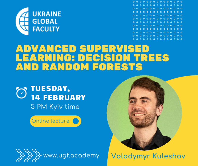 На платформі Ukraine Global Faculty відкрито реєстрацію на онлайн лекцію доцента Техніон-Корнельського інституту Джейкобса в Корнельському університеті та факультету комп’ютерних наук Корнельського університету, доктора філософії Volodymyr Kuleshov «Advanced Supervised Learning: Decision Trees and Random Forests».