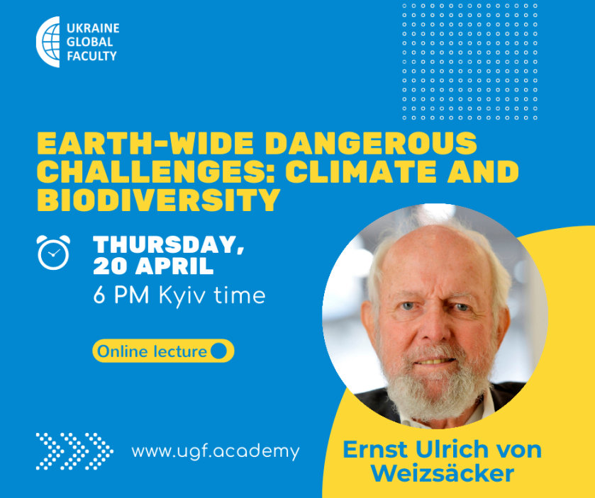 Міжнародна освітня платформа Ukraine Global Faculty проведе онлайн лекцію почесного президента Римського клубу, екс-голови комітету з навколишнього середовища Німецького Бундестагу, екс-директора Центру науки і технологій ООН у Нью-Йорку, доктора філософії Ernst Ulrich von Weizsäcker «Earth-wide dangerous challenges: climate and biodiversity».