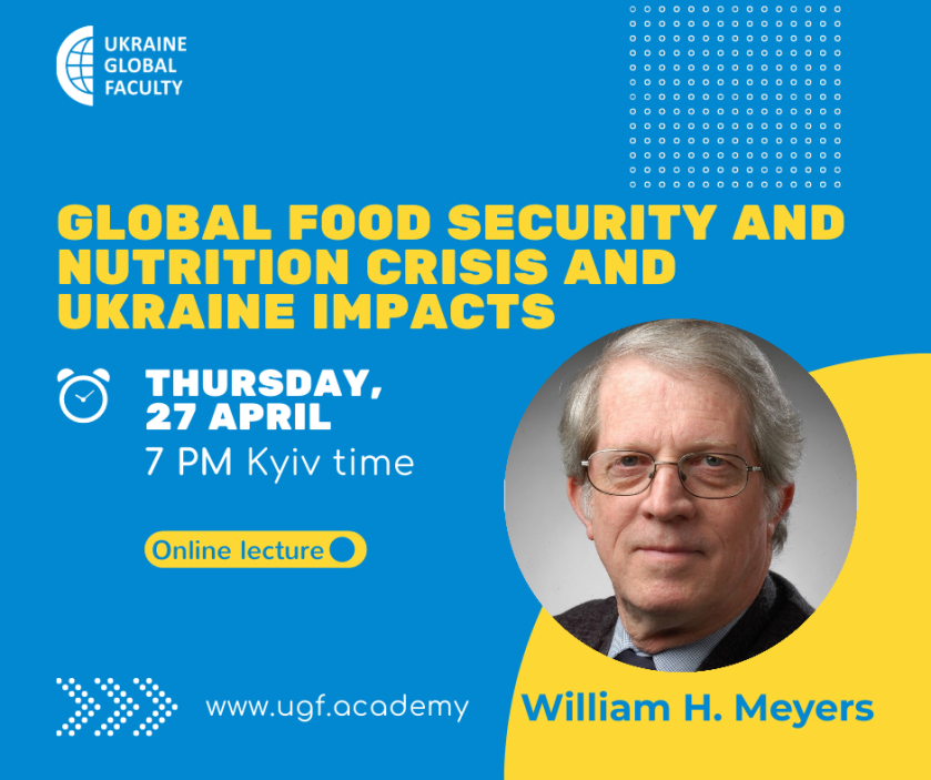 Міжнародна освітня платформа Ukraine Global Faculty проведе онлайн лекцію Почесного професора аграрної та прикладної економіки Науково-дослідного інституту продовольчої та аграрної політики Університету Міссурі, PhD William H. Meyers «Global Food Security and Nutrition Crisis and Ukraine Impacts»