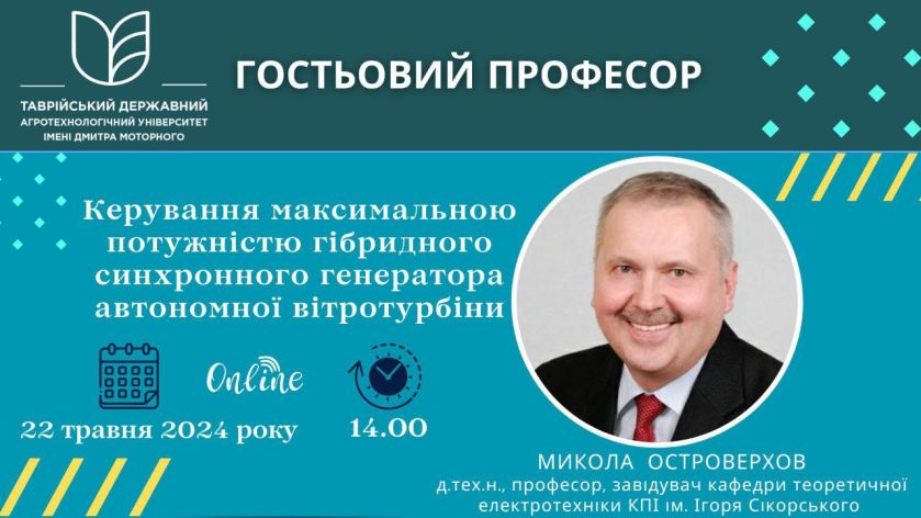 Запрошуємо 22 травня 2024 р. о 14.00 на гостьову лекцію «КЕРУВАННЯ МАКСИМАЛЬНОЮ ПОТУЖНІСТЮ ГІБРИДНОГО СИНХРОННОГО ГЕНЕРАТОРА АВТОНОМНОЇ ВІТРОТУРБІНИ».