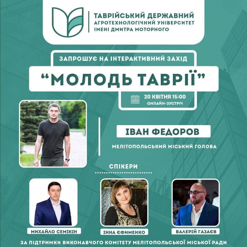 Таврійський державний агротехнологічний університет імені Дмитра Моторного за підтримки виконавчого комітету Мелітопольської міської ради запрошують випускників шкіл і коледжів 20 квітня о 15.00 на інтерактивний захід “МОЛОДЬ ТАВРІЇ”