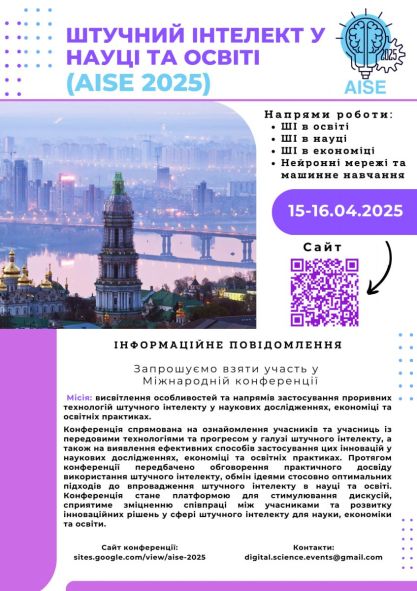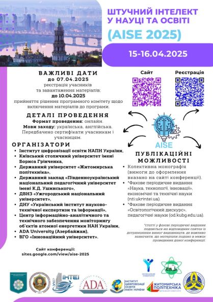 Український інститут науково-технічної експертизи та інформації запрошує на міжнародну наукову конференцію «Штучний інтелект у науці та освіті» (AISE 2025), яка відбудеться 15-16 квітня 2025 року.
