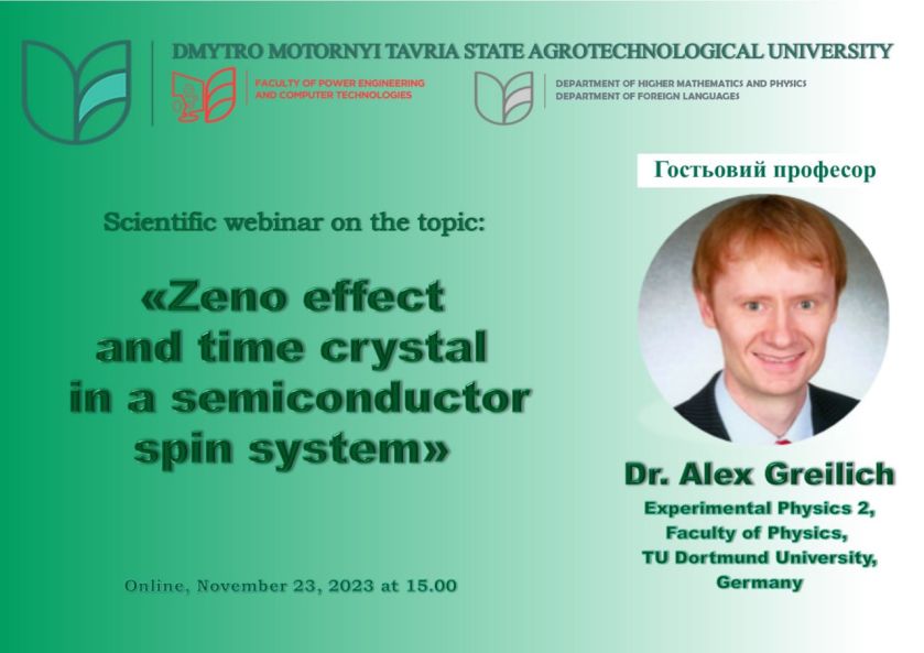 Запрошуємо науково-педагогічних працівників, викладачів, здобувачів вищої освіти факультетів / інституту та всіх охочих 23 листопада 2023 року о 15.00 год. (за Києвом) на науковий вебінар «Zeno effect and time crystal in a semiconductor spin system»