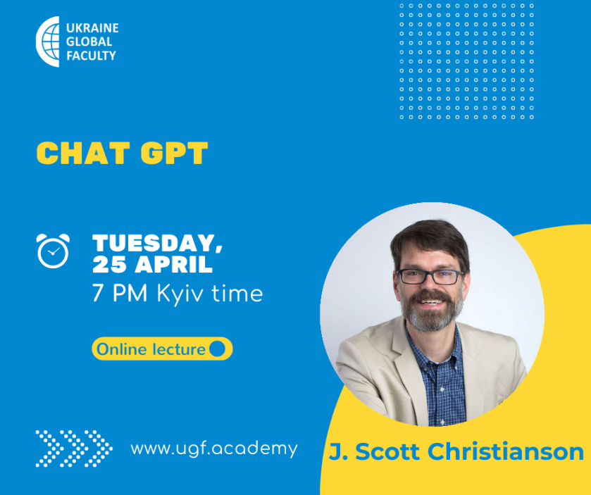 Міжнародна освітня платформа Ukraine Global Faculty проведе онлайн лекцію професора, директора Центру підприємництва та інновацій у Труласьк бізнес-коледжі Університету Міссурі J. Scott Christianson «Chat GPT».