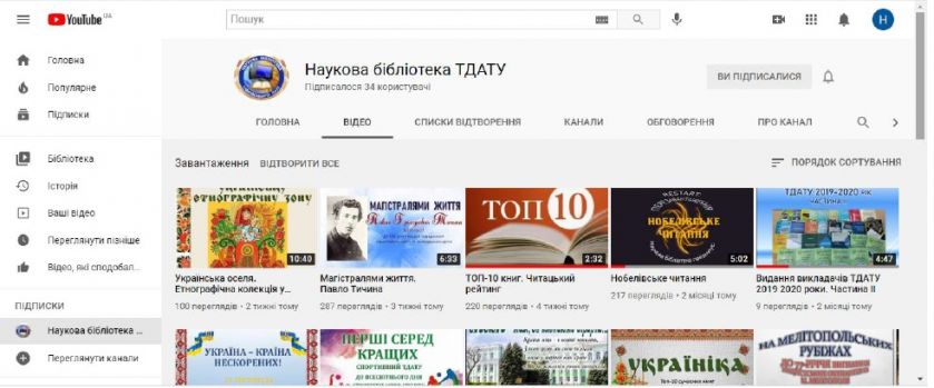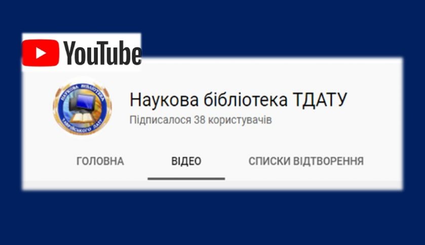 YouTube – сервіс, який завдяки простоті і зручності запропонованих користувачам технологій використання став найпопулярнішим місцем для розміщення відеофайлів і третьою у світі інтернет-платформою за кількістю відвідувачів. Кожна сучасна бібліотека має свій YouTube канал, не є винятком і наукова бібліотека ТДАТУ.
