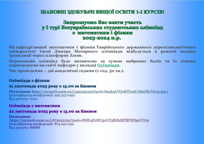 Запрошуємо взяти участь у І турі Всеукраїнських студентських олімпіад з математики і фізики 16.11.2023