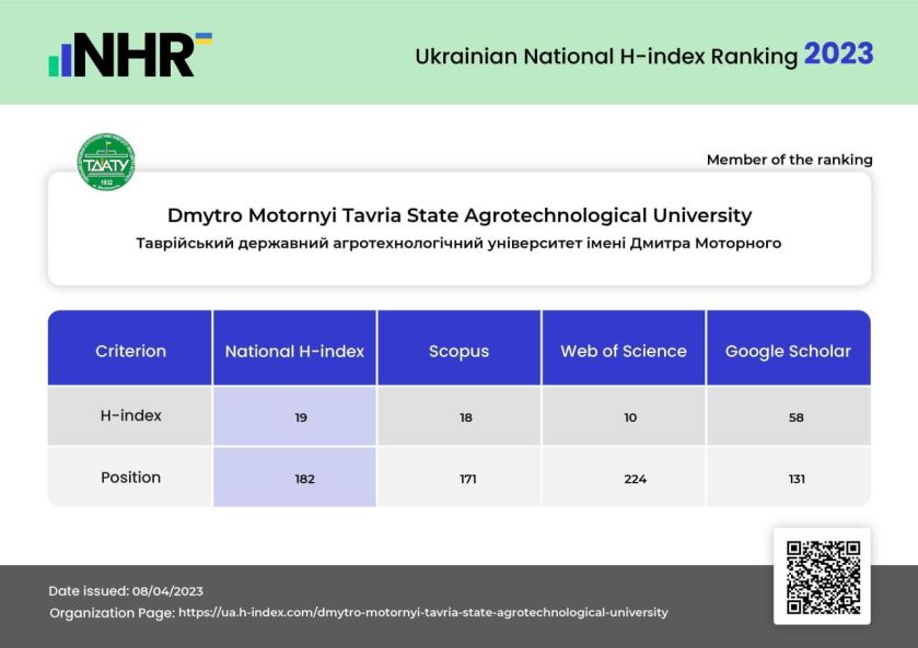 Рейтинг враховує сумарний показник індексу Гірша наукових установ України з урахуванням відомостей наукометричних баз даних та платформ Scopus, Web of Science та Google Scholar. На основі цих даних формується індикатор National H-index Ranking та відповідна ранжована позиція в рейтингу (Position).