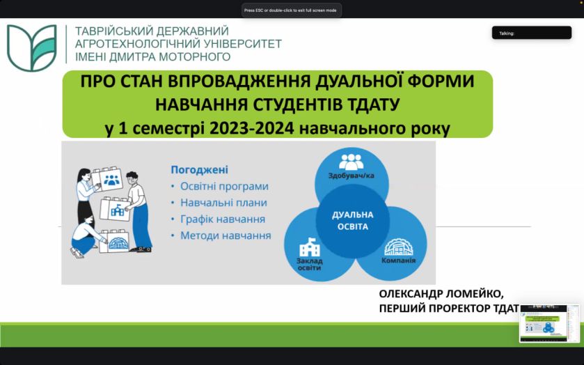Нагадаємо, що Таврійський ДАТУ був першим закладом вищої освіти, де була впроваджена дуальна форма. Це той випадок, коли у підготовці фахівців бере участь і ЗВО, і підприємство (установа, організація). Сутність такої системи полягає у тісній взаємодії підприємства та навчальних закладів на основі соціального партнерства, де обидві сторони є рівноправними партнерами, які розробляють та координують навчальний процес, здійснюють контроль за його результатами.
