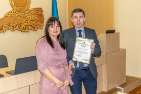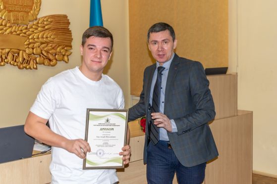 Далі ректор ТДАТУ Сергій Кюрчев урочисто вручив подяки Київського національного торговельно-економічного університету за підготовку та перемогу у Всеукраїнському конкурсі бізнес-проєктів «Бізнес – трамплін». Їх отримали: здобувач вищої освіти СВО 11СПТ групи факультету економіки та бізнесу Владислав Супрун, магістрант 25МБ АІ групи механіко-технологічного факультету Андрій Гера, к.е.н., доцент, завідувачка кафедри підприємництва, торгівлі та біржової діяльності Лариса Болтянська та доцент кафедри технічного сервісу та систем в АПК Борис Болтянський.