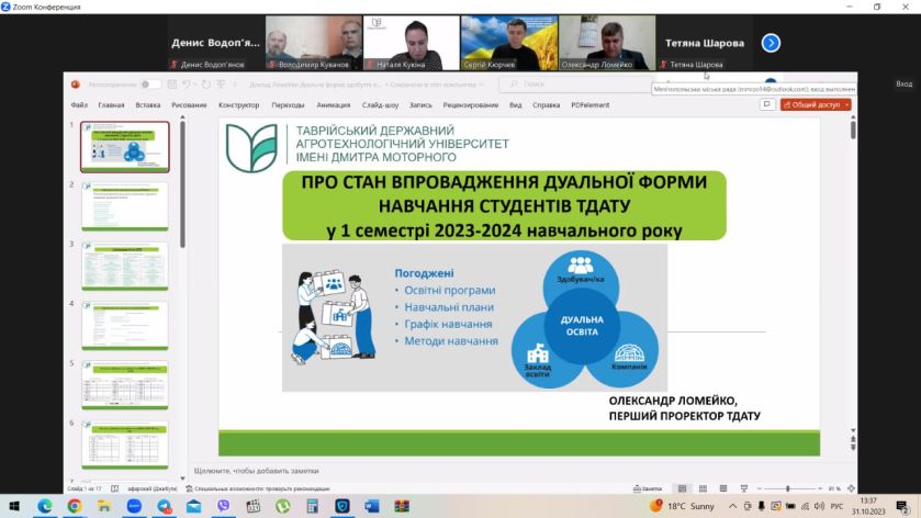 Порядок денний розпочався з питання про стан впровадження дуальної форми навчання студентів університету у І семестрі 2023-2024 н.р. Перший проректор Університету Олександр Ломейко доповідав з цього питання. Дуальна форма навчання успішно реалізується у ТДАТУ з 2014 року, коли студенти окрім теоретичних занять засвоюють та застосовують свої знання на виробництві. В своїй презентації Олександр Петрович зробив акцент на зміні географії підприємств-партнерів: якщо до повномасштабної війни це, в основному були місцеві підприємства, то зараз до співпраці поступово вдалося залучити партнерів з інших регіонів.