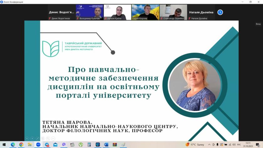 Про навчально-методичне забезпечення дисциплін 1 семестру 2023-2024 н.р. на Освітньому порталі університету доповіла начальник ННЦ Тетяна Шарова. У ТДАТУ багато уваги приділяється якості освітньої діяльності. У цьому аспекті важливим є вчасне наповнення навчально-методичними матеріалами Освітнього порталу університету та відповідність електронних навчальних курсів нормативним вимогам.
