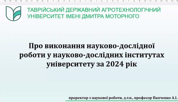 Про виконання науково-дослідної роботи у НДІ університету у 2024 році доповідав проректор з НР Анатолій Панченко. Не зважаючи на повномасштабну війну, яка триває вже три роки, університету вдалося зберегти чотири науково-дослідні інститути, які успішно функціонують та демонструють достойні показники своєї роботи. На сьогодні до складу ТДАТУ входять: НДІ механізації землеробства півдня України; НДІ агротехнологій та екології; НДІ соціально-економічного розвитку регіону; НДІ нанотехнологій та наноматеріалів.