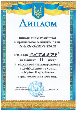 Таким чином, збірна чоловіча команда ТДАТУ по волейболу посіла ІІ сходинку VI Відкритого міжнародного волейбольного турніру «Кубок Кирилівки» серед чоловічих команд і здобули срібні нагороди змагань.