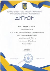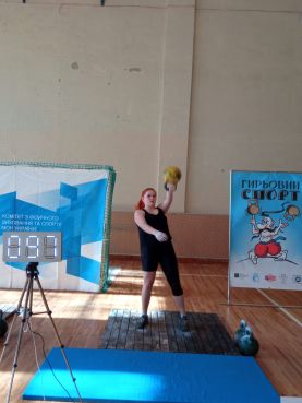 Ольга Москаленко, студентка IV курсу факультету агротехнологій та екології (41 ХТ) – ІІ місце у ваговій категорії понад 70 кг (123 підйоми 16-кг гирі);