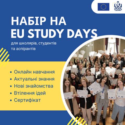 Освітній проєкт EU Study Days (Єврошколи) Представництва Європейського Союзу в Україні надає можливість старшокласникам, студентам та аспірантам дізнатися більше про Європейський Союз та відносини маж ЄС та Україною від ключових європейських та українських експертів у цій сфері.