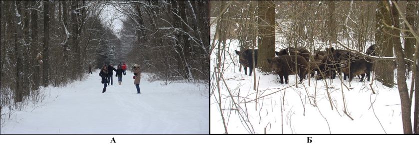 Б –  дикі кабани у вольєрі мисливського господарства