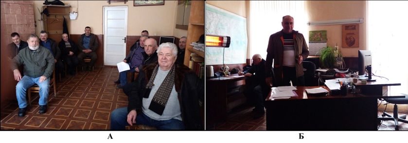 Рис. 6. Нарада керівників районних мисливських організацій УТМР, присвяченій  проведенню зимового обліку диких тварин (м. Чернівці: 17.02.2023):    А –  д. біол. наук, проф. Анатолій Волох (зліва);