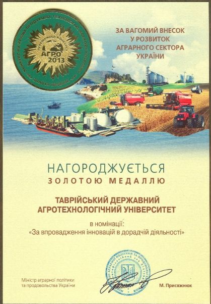 На Міжнародній виставці-ярмарку «АГРО–2013» у конкурсі на кращий експонат, технологію, наукову розробку ТДАТУ за представленими матеріалами отримав дві Золоті медалі та Дипломи VIР рівня: