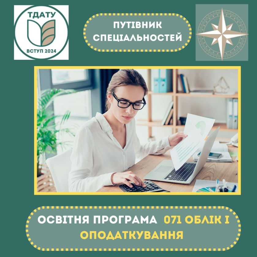 ТДАТУ пропонує освітню програму 071 ОБЛІК І ОПОДАТКУВАННЯ за освітніми рівнями Бакалавр, Магістр.