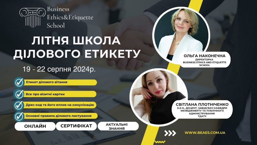 Світлана Плотніченко, к.е.н., доцент, завідувачка кафедри менеджменту та публічного адміністрування Таврійського державного агротехнологічного університету імені Дмитра Моторного запрошує вас відвідати інтенсив “ЛІТНЯ ШКОЛА ДІЛОВОГО ЕТИКЕТУ”!