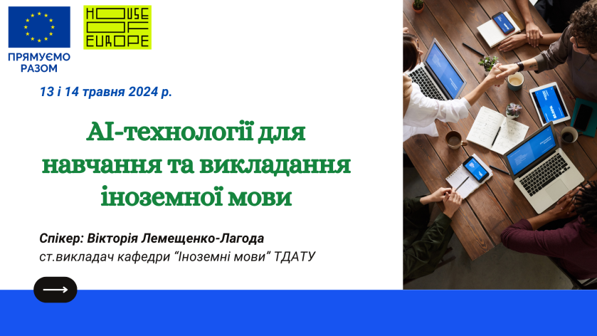 Запрошуємо викладачів та студентів відвідати вебінари «АІ-технології для навчання та викладання іноземної мови», які відбудуться 13 і 14 травня 2024 року.
