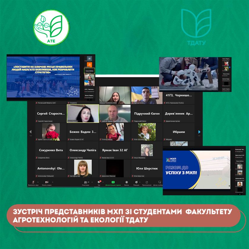 Шостого вересня відбулась онлайн зустріч представників «Агроіндустріального холдінгу МХП» зі студентами факультету агротехнологій та екології та кураторами щодо навчання студентів факультету АТЕ на підприємствах МХП на дуальній формі. Спікером зустрічі виступила представниця «Агроіндустріального холдінгу МХП» Марина Шептитська.
