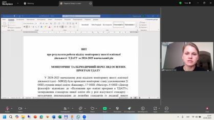 Завідувач відділу моніторингу якості освітньої діяльності Радміла Скляр ознайомила членів ради із основними напрямками діяльності, які реалізував відділ у 2024-2025 н.р., та результатами цієї роботи. Наголошено, зокрема, на значних досягненнях із акредитації та ліцензування освітніх програм.